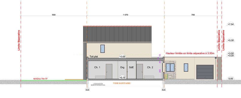 L’implantation de la maison en centre et à l’Est de parcelle, sur toute sa largeur centrale. La maison est mitoyenne avec une construction existante de la parcelle voisine, côté Sud.L’implantation de la maison permet d'ouvrir les pièces du rez-de-chaussée et de l’étage au Sud, à l’Est et à l’Ouest dont une fenêtre de toit de dimensions 78 cm par 98 cm, côté Nord.