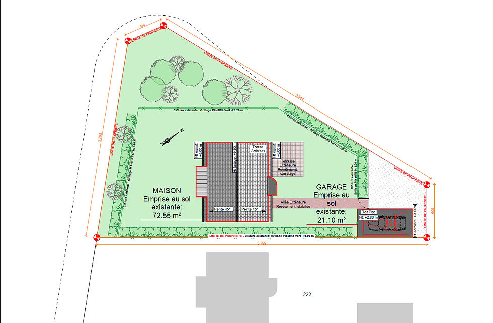 Le terrain est déjà entièrement planté et clôturé mais pas selon les limites séparatives de la parcelle. Les clôtures seront modifiées en grande partie sauf sur la limite séparative avec le voisin.