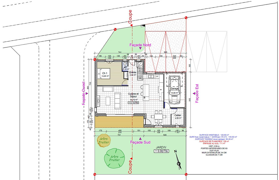 L’implantation de la maison permet d'ouvrir les pièces de vie de la maison au Nord et au Sud. L'entrée permet l'accès à un séjour ouvert sur la cuisine traversante, cela favorise l'éclairement naturel. Un cabinet de toilette et un placard se situent après l’entrée. Une chambre et un cellier occupent également le rez-de-chaussée. Le garage à même la maison, permet le stationnement d’une voiture, et donne un accès direct à la maison.